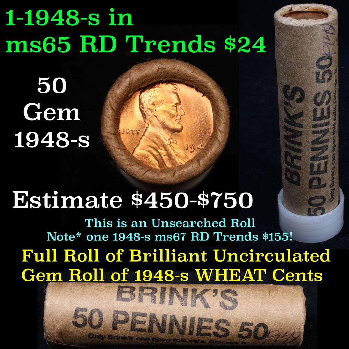 ***Auction Highlight*** Uncirculated 1c orig shotgun roll, 1948-s in old Brink's wrapper. A terrific orig shotgun roll of Lincoln cents. The ends are Gem cherry red. This is in an Old Brinks wrapper, "Only Brinks can open this safe, Chicago, IL". Trends ms65 rd $24. Estimate $1000