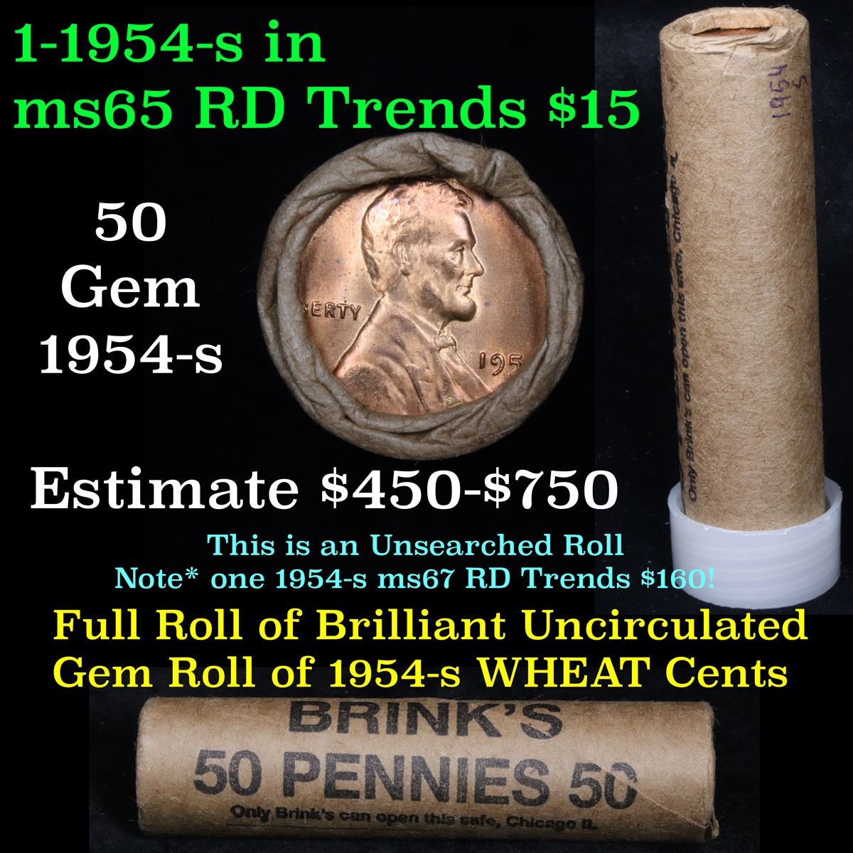 ***Auction Highlight*** Uncirculated 1c orig shotgun roll, 1954-s In Old Brinks wrapper . A terrific orig shotgun roll of Lincoln cents. All coins cherry red. This is in an Old Brinks wrapper, "Only Brinks can open this safe, Chicago, IL". Trends ms65 rd $15. Estimate $750