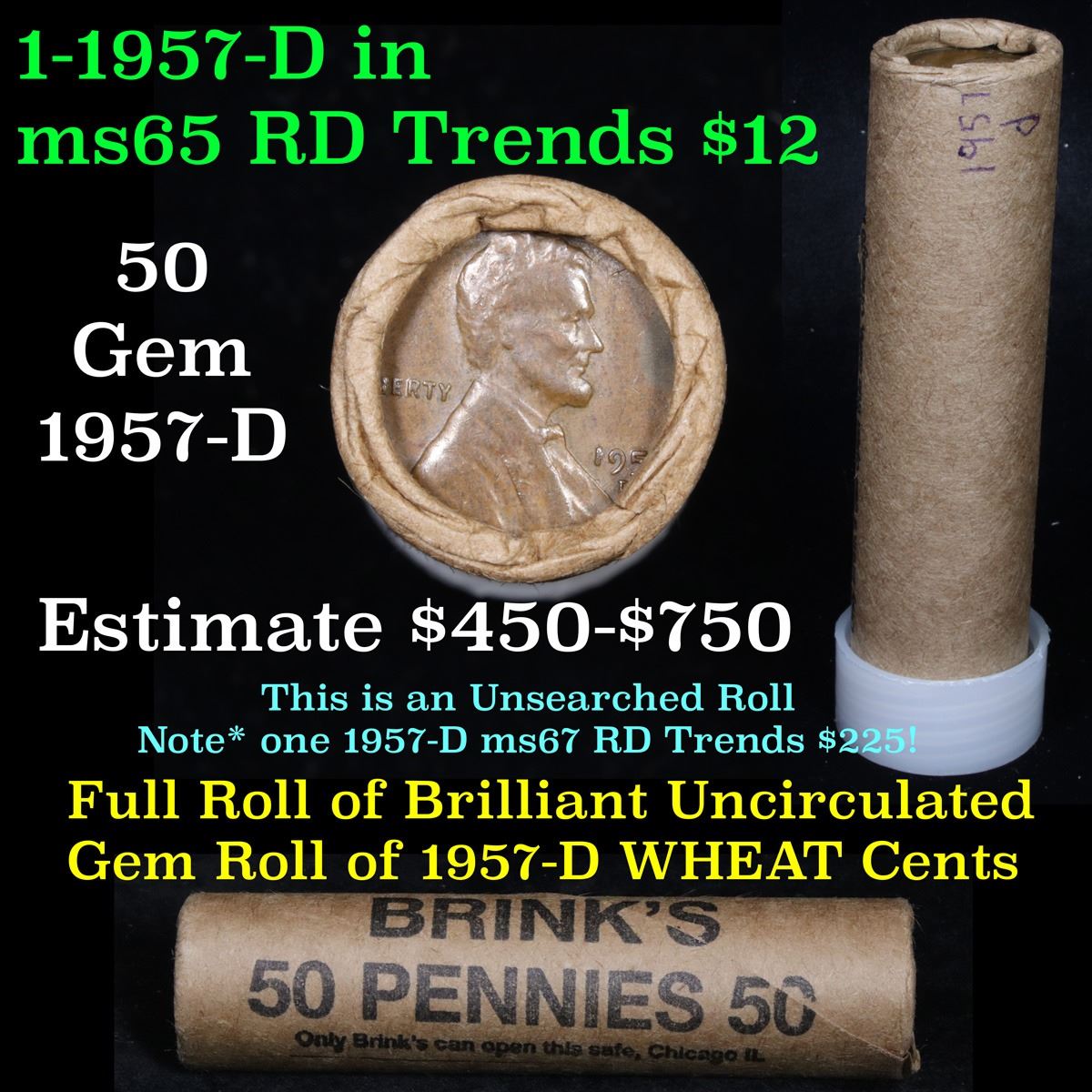 ***Auction Highlight*** Uncirculated 1c orig shotgun roll, 1957-d In Old Brinks wrapper . A terrific orig shotgun roll of Lincoln cents. All coins cherry red. This is in an Old Brinks wrapper, "Only Brinks can open this safe, Chicago, IL". Trends ms65 rd $12 Estimate $600