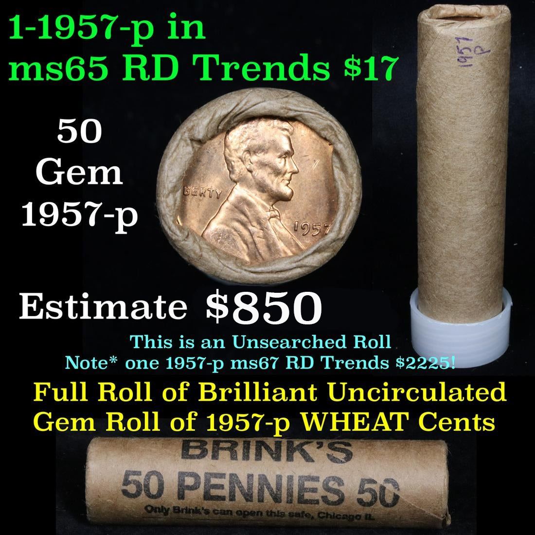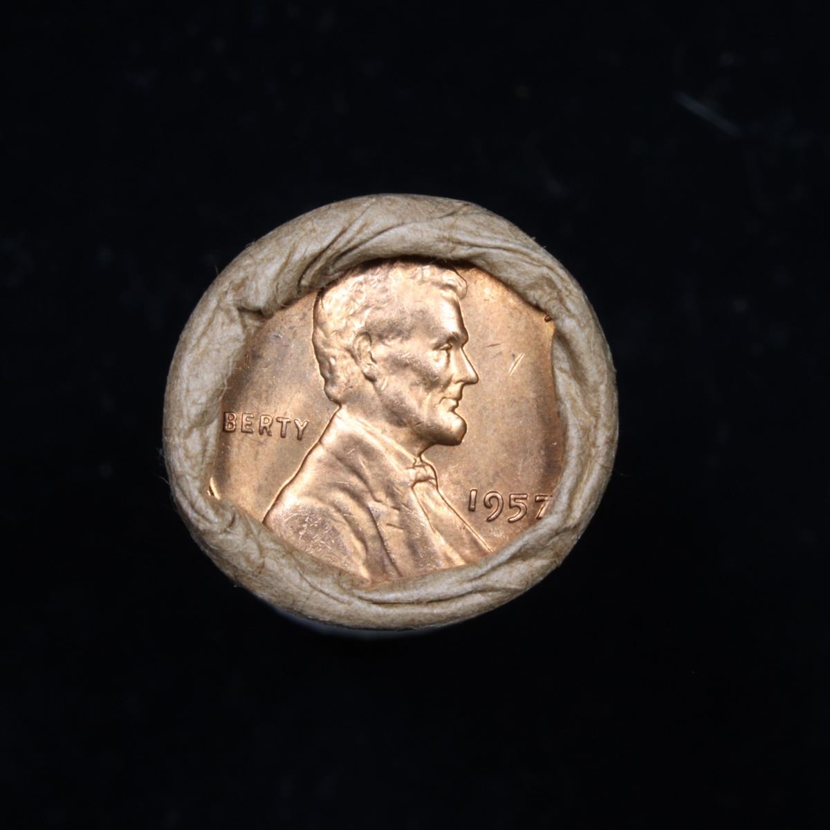 ***Auction Highlight*** Uncirculated 1c orig shotgun roll, 1957-p In Old Brinks wrapper (fc)