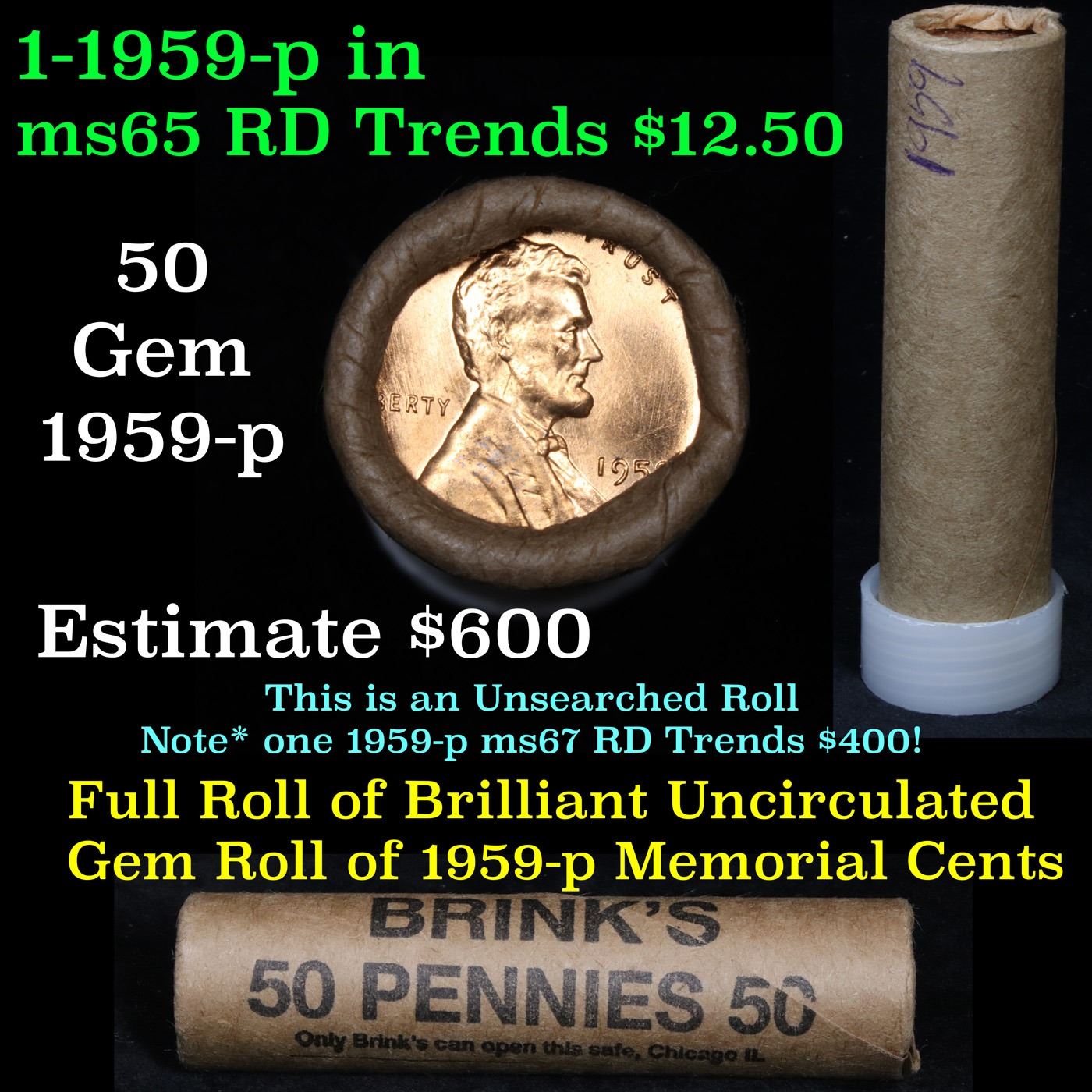 ***Auction Highlight*** Uncirculated 1c orig shotgun roll, 1959-p In Old Brinks wrapper Grades. A terrific orig shotgun roll of Lincoln cents. All coins cherry red. This is in an Old Brinks wrapper, "Only Brinks can open this safe, Chicago, IL". Trends ms65 rd $12.50 Estimate $600