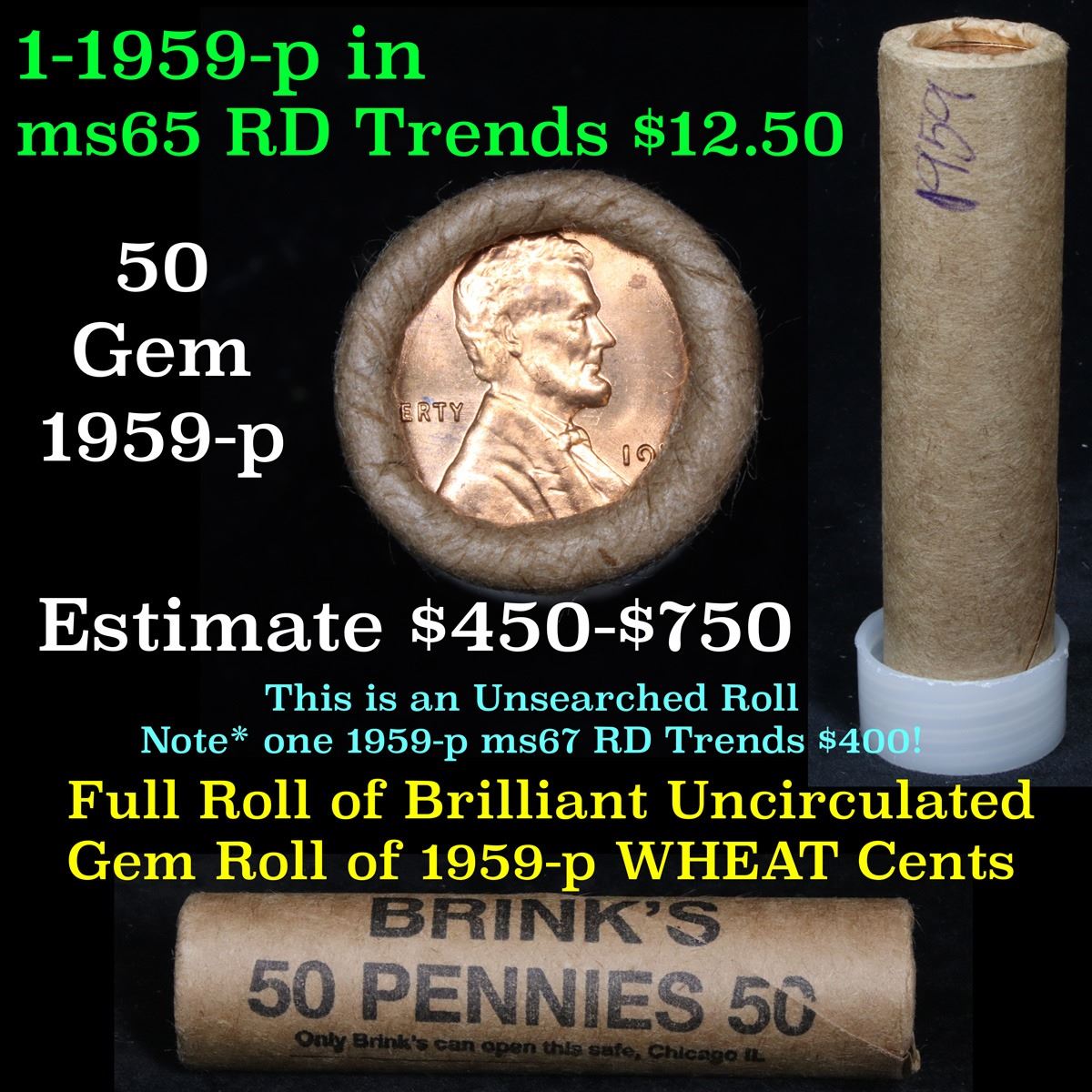 ***Auction Highlight*** Uncirculated 1c orig shotgun roll, 1959-p In Old Brinks wrapper . ÊA terrific orig shotgun roll of Lincoln cents. All coins cherry red. This is in an Old Brinks wrapper, "Only Brinks can open this safe, Chicago, IL".ÊTrends ms65 rd $12.50. Estimate $625. One coin in ms67rd is $400, none graded finer.