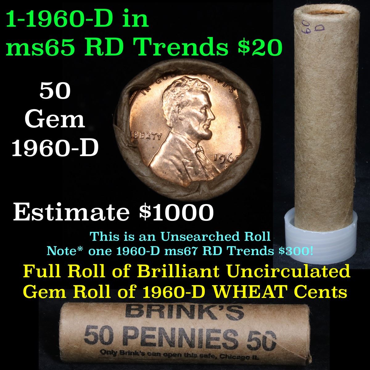 ***Auction Highlight*** Uncirculated 1c orig shotgun roll, 1960-d In Old Brinks wrapper . ÊA terrific orig shotgun roll of Lincoln cents. All coins cherry red. This is in an Old Brinks wrapper, "Only Brinks can open this safe, Chicago, IL".ÊTrends ms65 rd $15. Estimate $750. One coin in ms67rd is $265, none graded finer.