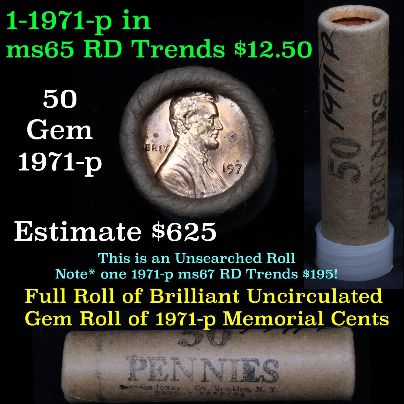 ***Auction Highlight*** Uncirculated 1c orig shotgun roll, 1971-p In Standard Johnson Co wrapper . A terrific orig shotgun roll of Lincoln cents. All coins cherry red. This is in an Standard Johnson Co wrapper. Trends ms65 rd $12.50 Estimate $625