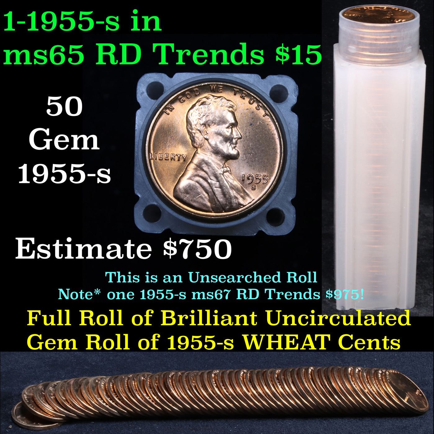 ***Auction Highlight*** Uncirculated 1c roll, 1955-s 50 pcs. A terrific orig shotgun roll of Lincoln cents. All coins cherry red.Trends ms65 rd $15 Estimate $750