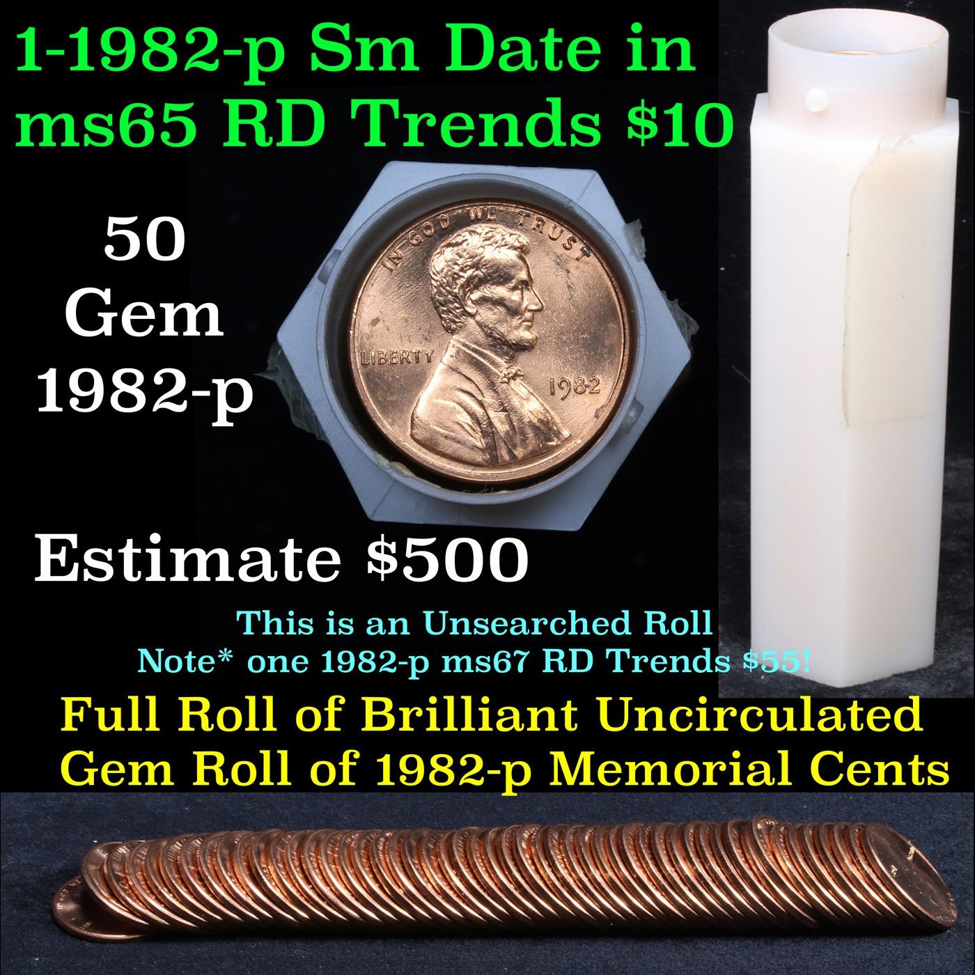 ***Auction Highlight*** Uncirculated 1c roll, 1982-p Zinc Small Date 50 pcs. A terrific roll of Lincoln cents. All coins cherry red. Trends ms65 rd $10 Estimate $500