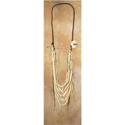 Crow Loop Necklace. 25" long when worn. Twisted hide & tacked harness leather with shell & trade beads. 19th century. (est. $3,500-5,50...