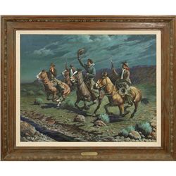 Dan Cody Muller (1889-1977). Stampede. 36" x 48" oil on board. Signed lower left: DAN MULLER. (est. $6,000-9,000). Provenance: The S. Geor...