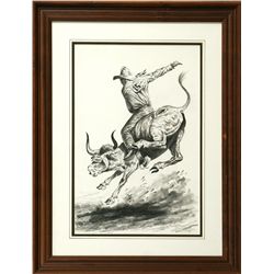 Dan Cody Muller (1889-1977). Eight Seconds. 15" x 10" charcoal. Signed lower left: DAN MULLER. Label verso: Page 9…."8 seconds is all...