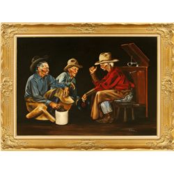 Gerald Farm (b. 1935). The Storytellers. 30" x 40" oil on board. Signed lower right: G. FARM 1971. (est. $2,000-4,000). Provenance: The S....