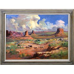George Burrows (?-1994). The Skies Over Monument Valley. 30" x 40" oil on canvas. Signed lower right: Burrows © 88. (est. $2,500-3,50...