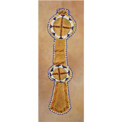 Apache Awl Case. 11" x 3". Beaded on both sides in pumpkin, blue & white beads on ochred hide. Entire outside edge is bordered in bead...