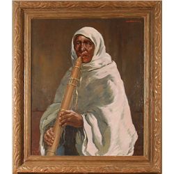 Odon Hullenkremer (1888-1978). Flute Player. 29" x 24" oil on board. Signed upper right: Odon Hullenkremer. (est. $4,000-6,000). CONDITION...