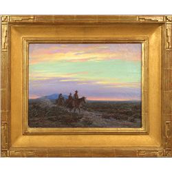 Clyde Forsythe (1885-1962). Riders Return. 12" x 16" oil on board. Signed lower right: CLYDE FORSYTHE. (est. $2,500-4,500). CONDITION REPO...