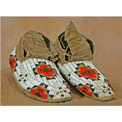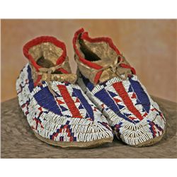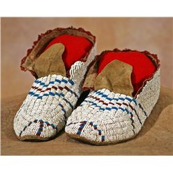 Sioux Moccasins. 9 ½" long and beaded mostly in white with highlights of blue and translucent red. Edged in scalloped red beadwork. Early ...