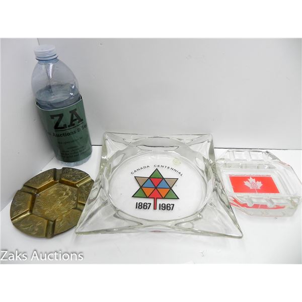 LOT OF 3 VINTAGE GLASS AND BRASS ASHTRAYS
