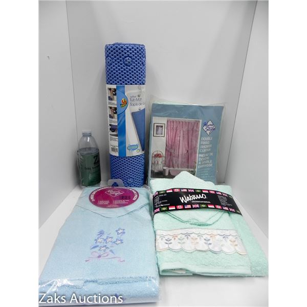 NOS NEW VINTAGE SHOWER CURTAIN, TOWEL AND BATH TUB MAT