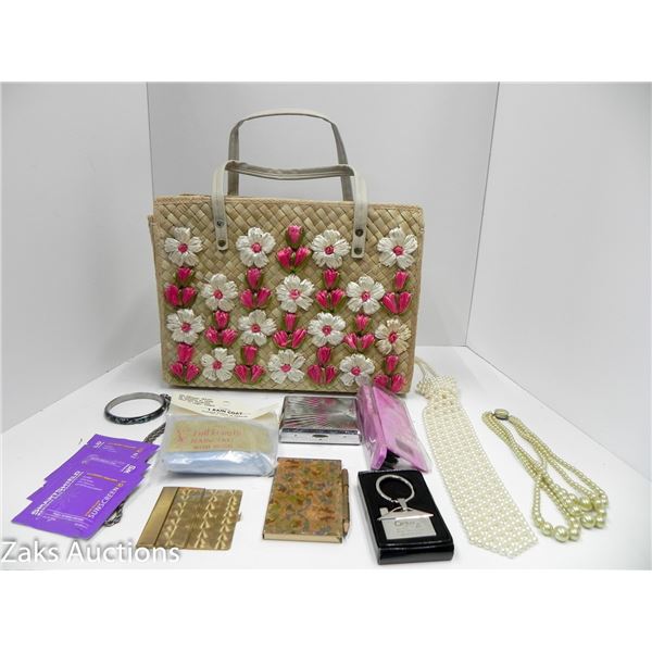 VINTAGE STRAW BAG WITH CONTENTS