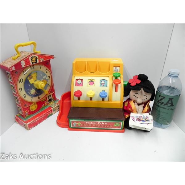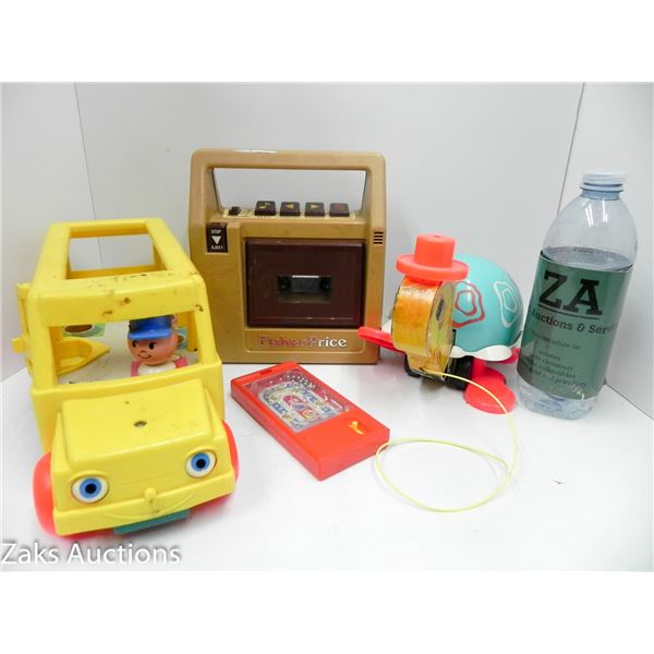 FISHER PRICE LOT 2. LITTLE PEOPLE BUS, TAPE PLAYER, TURTLE PULL-A-ALONG AND VINTAGE HAND GAME