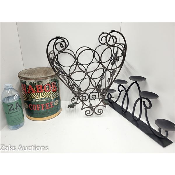 MISC DECOR LOT. OLD NABOB COFFEE TIN, 6 BOTTLE WINE HOLDER (UPSIDE DOWNIN PICTURE LOL) AND 5 CANDLE HOLDER