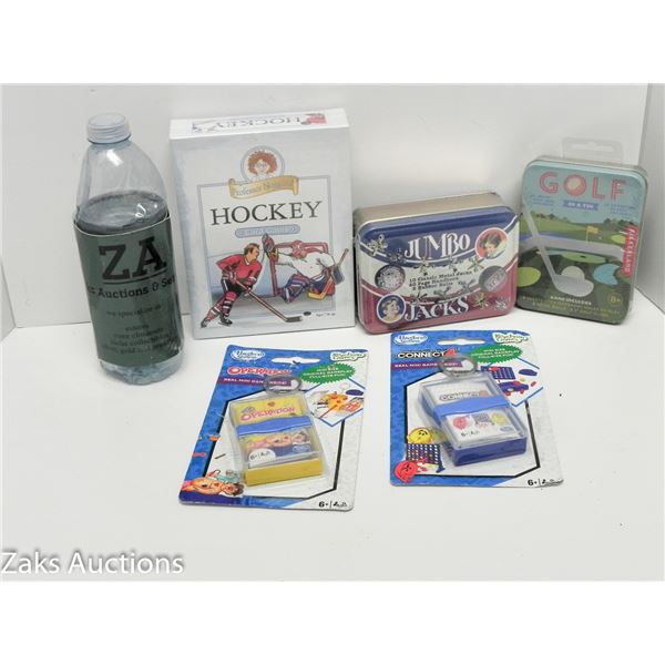 PROFESSOR HOGINS CARD GAME, KIRKLAND GOLF IN TIN, JUMBO JACKS IN TIN W/NEW 2 HASBRO KEYCHAIN GAMES OPERATION & CONNECT 4