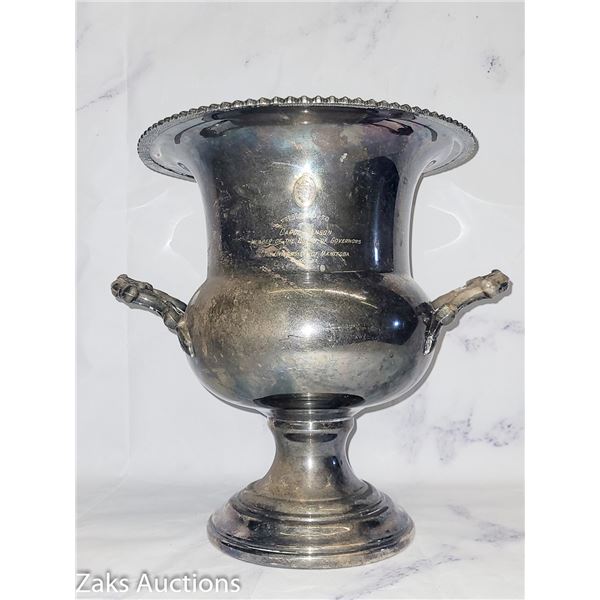 Large Silver Plate Loving Cup 11" with inscription. Presented to Carol Manson Member of the Board of Govenors of The University of Alberta 1986...