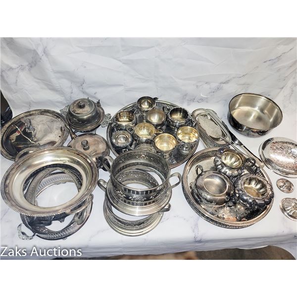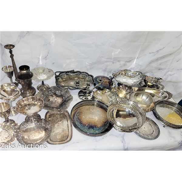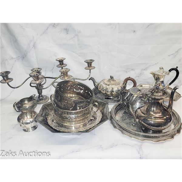 Misc Bin of Silver Plate including: Trays, Teapots, Cream & Sugars + other Misc