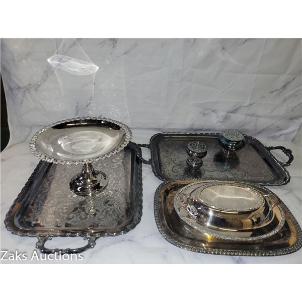 Lot of 2 Silver Plate Trays 25" long, 15" wide, engraved. Heather Gayle Smith & Covered Vegetable Dish & Cake Stand, 2 Flower Frog...