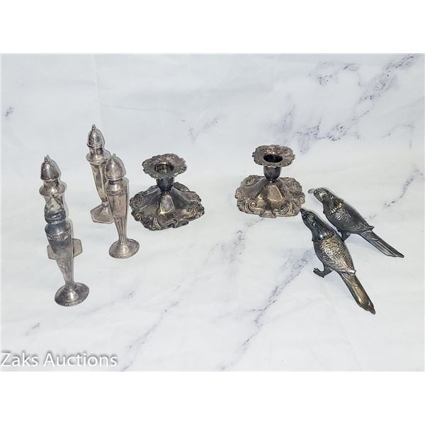 3 Set of Silver Plate Candle Holders & Silver Plate (1950s) Pheasant Salt & Pepper Shakers