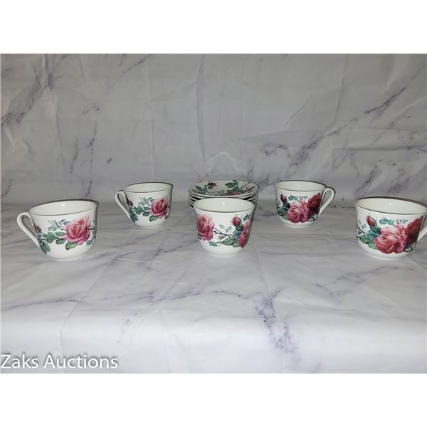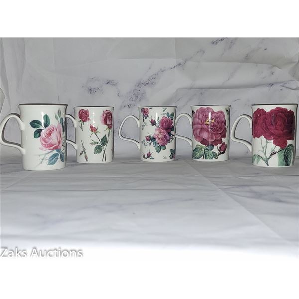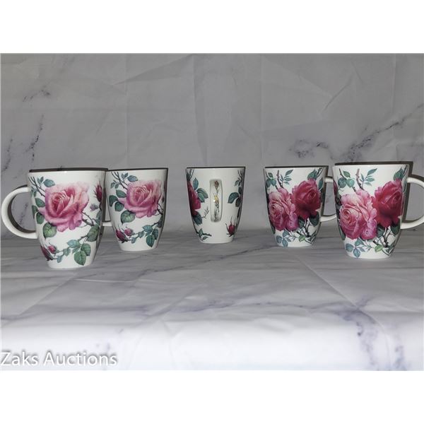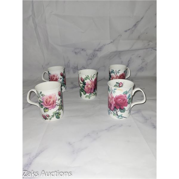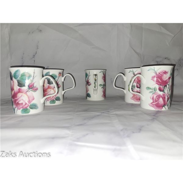 Lot of 5 Roy Kirkham English Rose Mugs China, only 1 mug has the floral design on the handle, the other 4 are design-less.