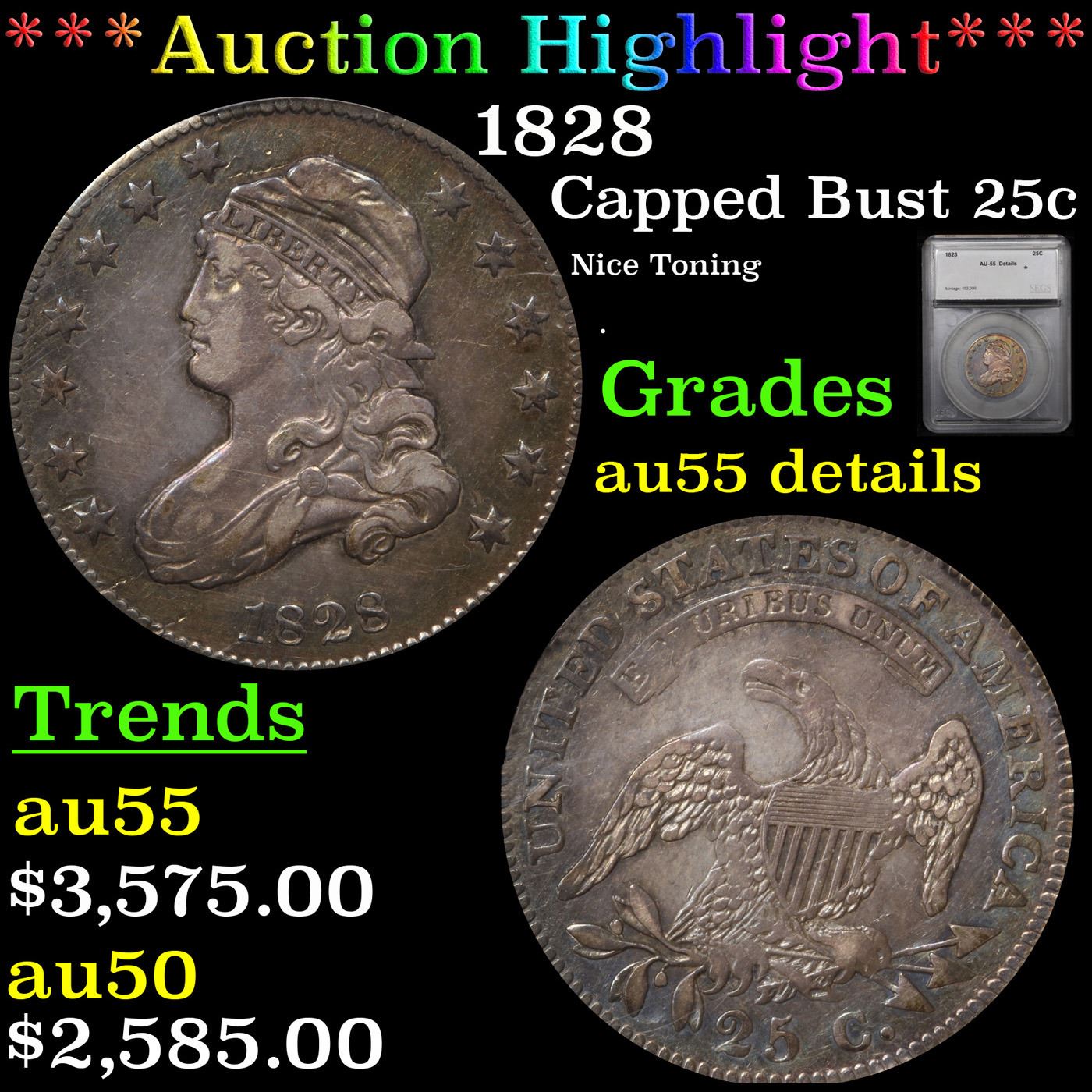 ***Auction highlight*** 1828 Capped Bust Quarter 25c Graded au55 details By SEGS.