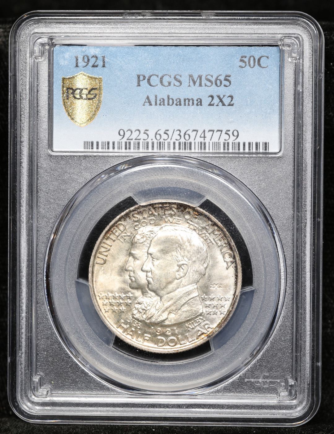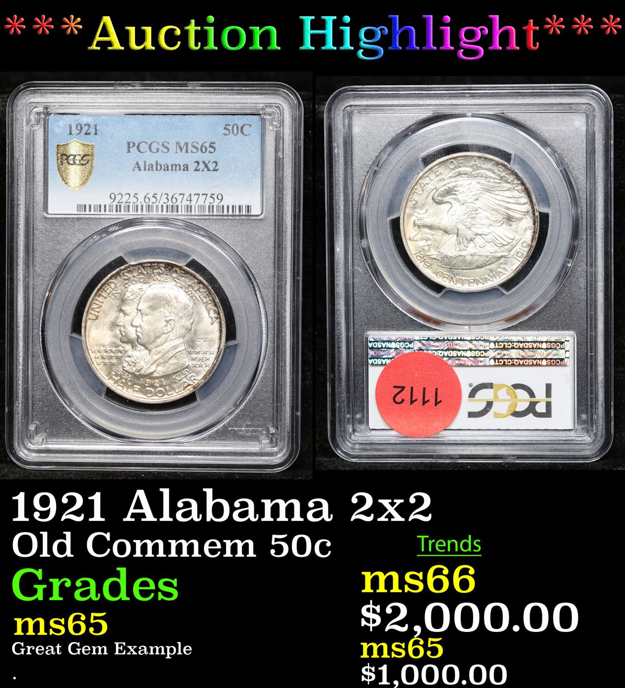 ***Auction highlight*** PCGS 1921 Alabama 2x2 Old Commem Half Dollar 50c Graded ms65 By PCGS. Uncirculated Examples will still Posses Luster on the Higher Points of the Design, namely on Kilby’s Upper Ear and on the Eagle’s Breast, Leg and Talons. Wear First Appears on Kilby's Forehead and Cheek and on the Eagle's Neck, Wingtip and Upper Edge of its Wing. Only 10% of the Issue was Made with the 2x2 Mark.