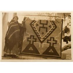 Navajo Weaving. Two Grey Hills area. Unusual round shape, 40" diameter. Pictorial designs with image of "Big Thunder". Woven by Mary ...