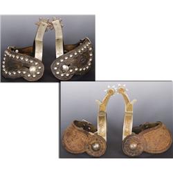 Two Pairs of Gal-Leg Spurs. Pair one is unmarked single mounted iron spurs decorated with silver and copper single mounted. Fine condition. Pair two i