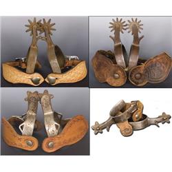 Collection of Four Pairs of Crockett Spurs. (1) Engraved iron spurs with 12 point rowels. Old cowboy straps. Original but now brown. (2) Plain iron sp