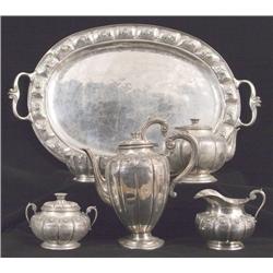 Mexican Silver-plated Tea Service. Great repousee work. 5 pieces plus beautiful tray. All in useable condition. c. 1920s. (est $1,200-1,500)