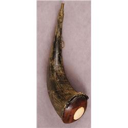 19th Century Powder Horn. 12" long. Constructed from Buffalo Horn. Base is wood with bone inlay. Spout is brass. Rare. (est $1,200-1,500)