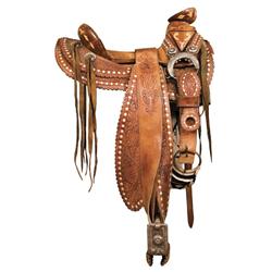 Mexican Saddle. Ornately inlaid wood tree and fine tooled leather. Has silver inlaid stirrups, cinch ring and conchos. circa 1930s. Fine condition. (e