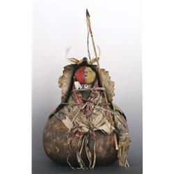 Robert Rivera. "Deer Warrior". Gourd Doll. 12”x 8”. 1998. Hide, gourd, paint, beads, etc. Fine condition. (est $400-500)