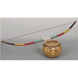 Hopi Pueblo Indian Bow Together with Hopi Pottery Bowl. (1) Bow is 35" long. Multicolor paint. Fine condition. (2) Bowl is 5 ½” x 6 ½...
