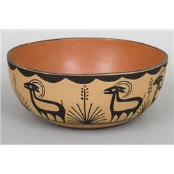 Large Santa Domingo Dough Bowl. 8" x 19 ½”. Pictorial designs. Signed Vidal Aguilar. Fine condition. (est $1,000-1,500)