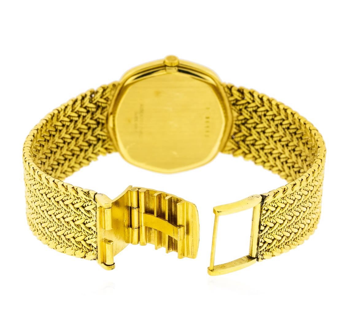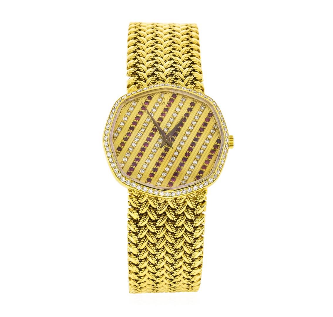 One, Audemars Piguet Classique Diamond & Ruby wristwatch electronically tested 18KT Yellow gold, Octagonal Shaped Cushion Case: 32 x 29mm, Outer Case Back, engraved with the manufacturers name, information, and ID numbers, space available for engraving, Swiss Hallmarked Inner Case Back: engraved with the manufacturers name, Bezel: diamond set, Crystal: synthetic sapphire lens. Audemars Piguet Swiss Movement: seventeen jewel, adjustments for heat & cold, Isochronism, and five positions, mechanical. Dial: set with alternating diagonal rows of diamonds and lab created rubies, Audemars Piguet Bracelet: flexible woven wheat link mesh, Condition: G-7 near Mint. Six and three quarter inch length. Swiss and Audemars Piguet Hallmarked 18KT Yellow gold clasp, with high relief logo. Containing: Sixty-Four prong set round brilliant cut diamonds, measuring 1.40 - 1.40 x 0.84mm (depth est.) approximate total weight of 64 Stones = 0.64ct. Clarity: VVS-2 to VS-1 Color F - H Sixty-Six prong set single cut diamonds, measuring 1.20 - 1.20 x 0.72mm (depth est.) approximate total weight of 66 Stones = 0.45ct. Graded in the setting. Clarity: VVS-2 to VS-2 Color F - H. Total Weight of Diamonds 1.09ct. Total Weight of Watch 84.80gm. AIG Appraised at $17,440.00.