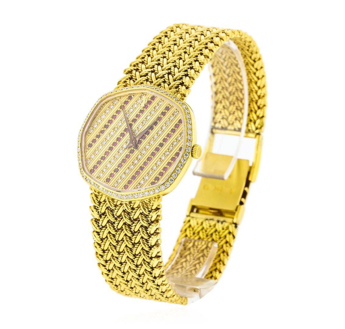One, Audemars Piguet Classique Diamond & Ruby wristwatch electronically tested 18KT Yellow gold, Octagonal Shaped Cushion Case: 32 x 29mm, Outer Case Back, engraved with the manufacturers name, information, and ID numbers, space available for engraving, Swiss Hallmarked Inner Case Back: engraved with the manufacturers name, Bezel: diamond set, Crystal: synthetic sapphire lens. Audemars Piguet Swiss Movement: seventeen jewel, adjustments for heat & cold, Isochronism, and five positions, mechanical. Dial: set with alternating diagonal rows of diamonds and lab created rubies, Audemars Piguet Bracelet: flexible woven wheat link mesh, Condition: G-7 near Mint. Six and three quarter inch length. Swiss and Audemars Piguet Hallmarked 18KT Yellow gold clasp, with high relief logo. Containing: Sixty-Four prong set round brilliant cut diamonds, measuring 1.40 - 1.40 x 0.84mm (depth est.) approximate total weight of 64 Stones = 0.64ct. Clarity: VVS-2 to VS-1 Color F - H Sixty-Six prong set single cut diamonds, measuring 1.20 - 1.20 x 0.72mm (depth est.) approximate total weight of 66 Stones = 0.45ct. Graded in the setting. Clarity: VVS-2 to VS-2 Color F - H. Total Weight of Diamonds 1.09ct. Total Weight of Watch 84.80gm. AIG Appraised at $17,440.00.