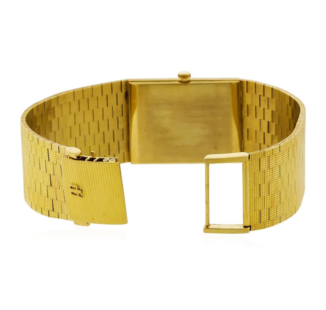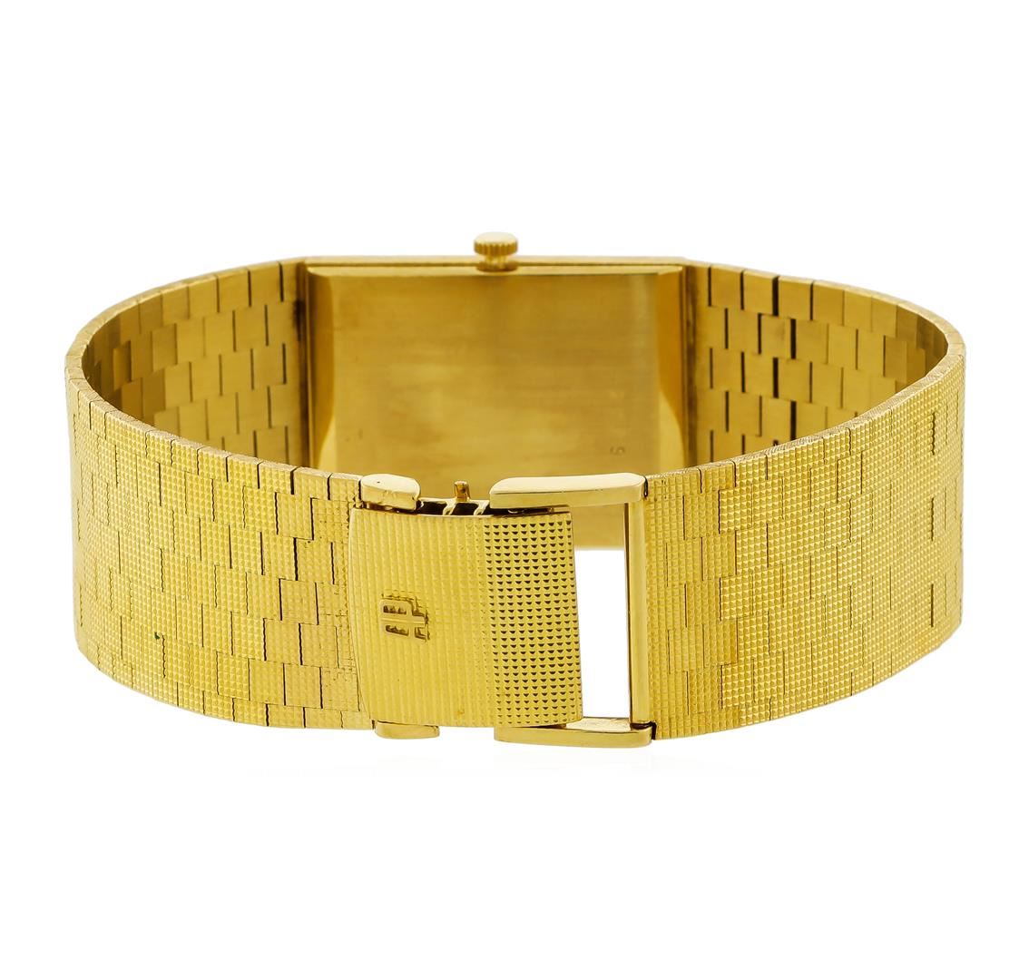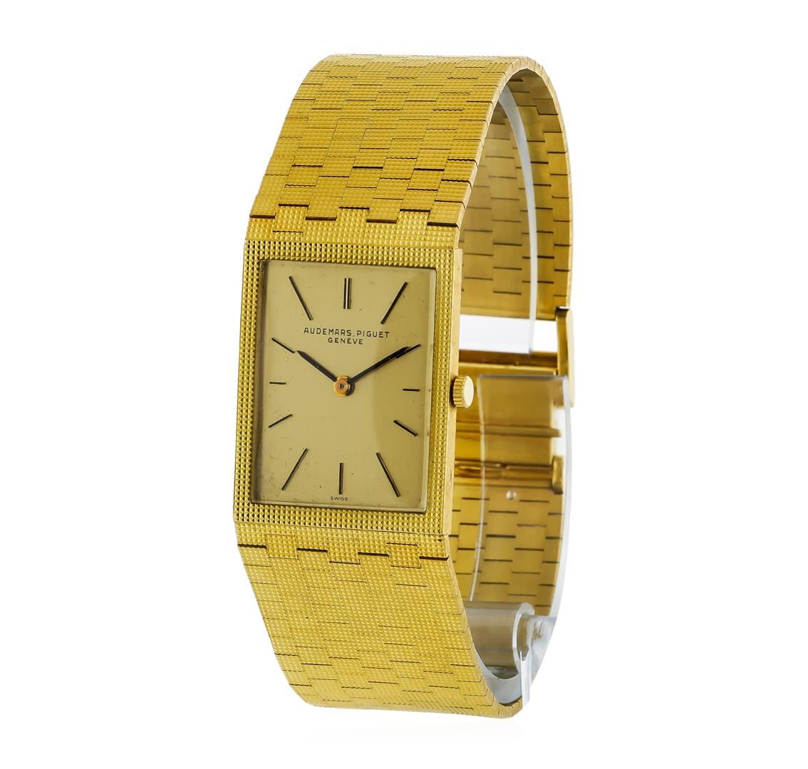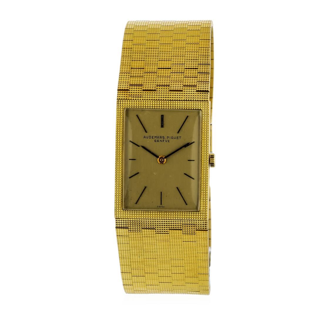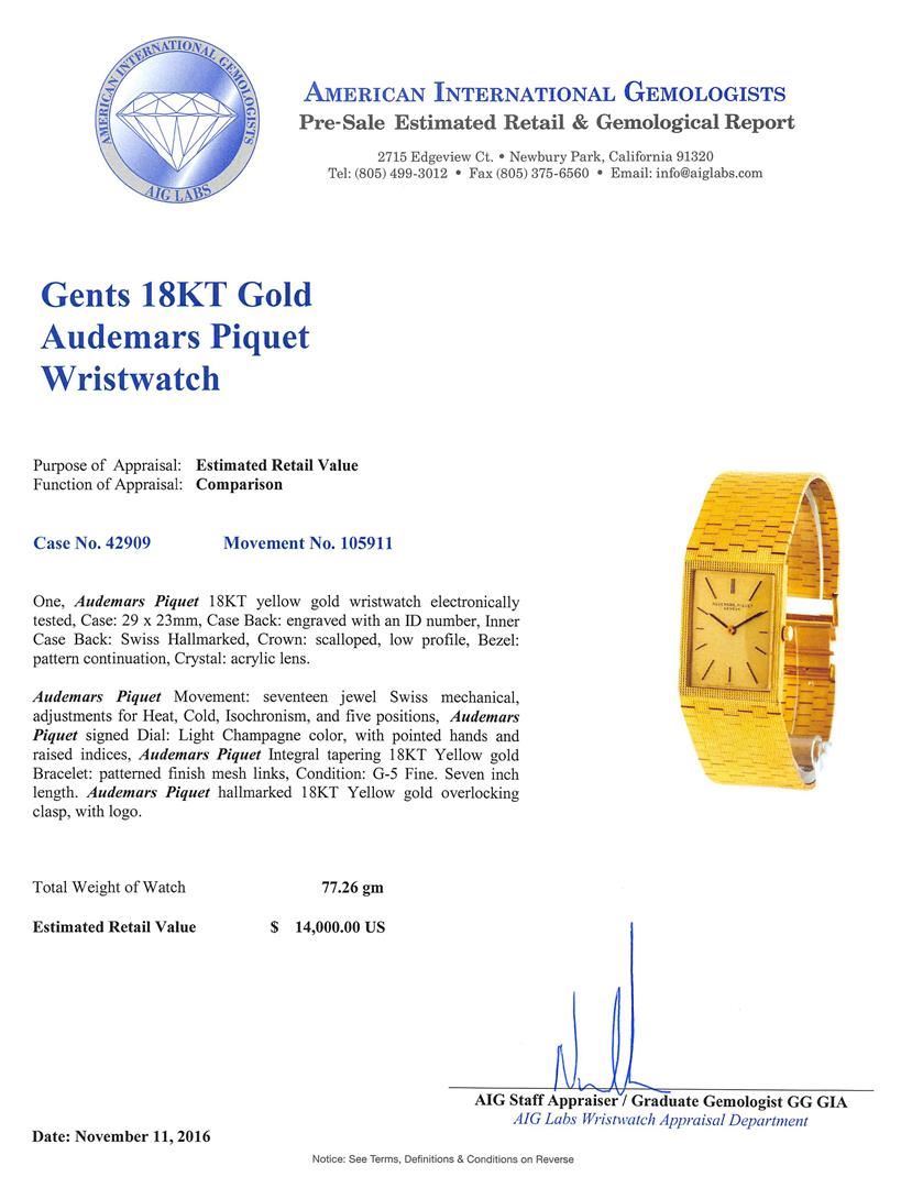 One, Audemars Piquet 18KT yellow gold wristwatch electronically tested, Case: 29 x 23mm, Case Back: engraved with an ID number, Inner Case Back: Swiss Hallmarked, Crown: scalloped, low profile, Bezel: pattern continuation, Crystal: acrylic lens. Audemars Piquet Movement: seventeen jewel Swiss mechanical, adjustments for Heat, Cold, Isochronism, and five positions, Audemars Piquet signed Dial: Light Champagne color, with pointed hands and raised indices, Audemars Piquet Integral tapering 18KT Yellow gold Bracelet: patterned finish mesh links, Condition: G-5 Fine. Seven inch length. Audemars Piquet hallmarked 18KT Yellow gold overlocking clasp, with logo. Total Weight of Watch 77.26gm. AIG Appraised at $14,000.00.