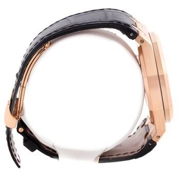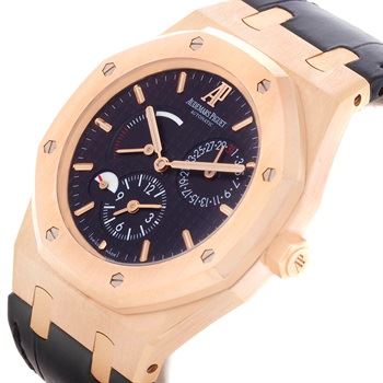 One Audemars Piguet Royal Oak Dual Time 18K Rose Gold Watch. The watch is in excellent condition and the details are as follows: Model: 26120OR.00.D002CR.01, Movement: Automatic self-winding movement. Case: Brushed with polished bevel edges 18K rose gold case 39.0 mm in diameter. Bezel: 18K rose gold bezel punctuated with 8 signature screws. Crystal: Scratch resistant sapphire crystal. Dial: Metallic black dial with and Grande Tapisserie waffle design. Applied rose gold index hour markers and hands with luminescent fill. Dual/Second Time zone sub-dial with an am/pm indicator at the 6 o'clock position. Power Reserve indicator located at the top left side of the dial. Date indicator sub-dial at the top right side of the dial. Bracelet: Black leather strap with 18K rose gold deployment clasp.