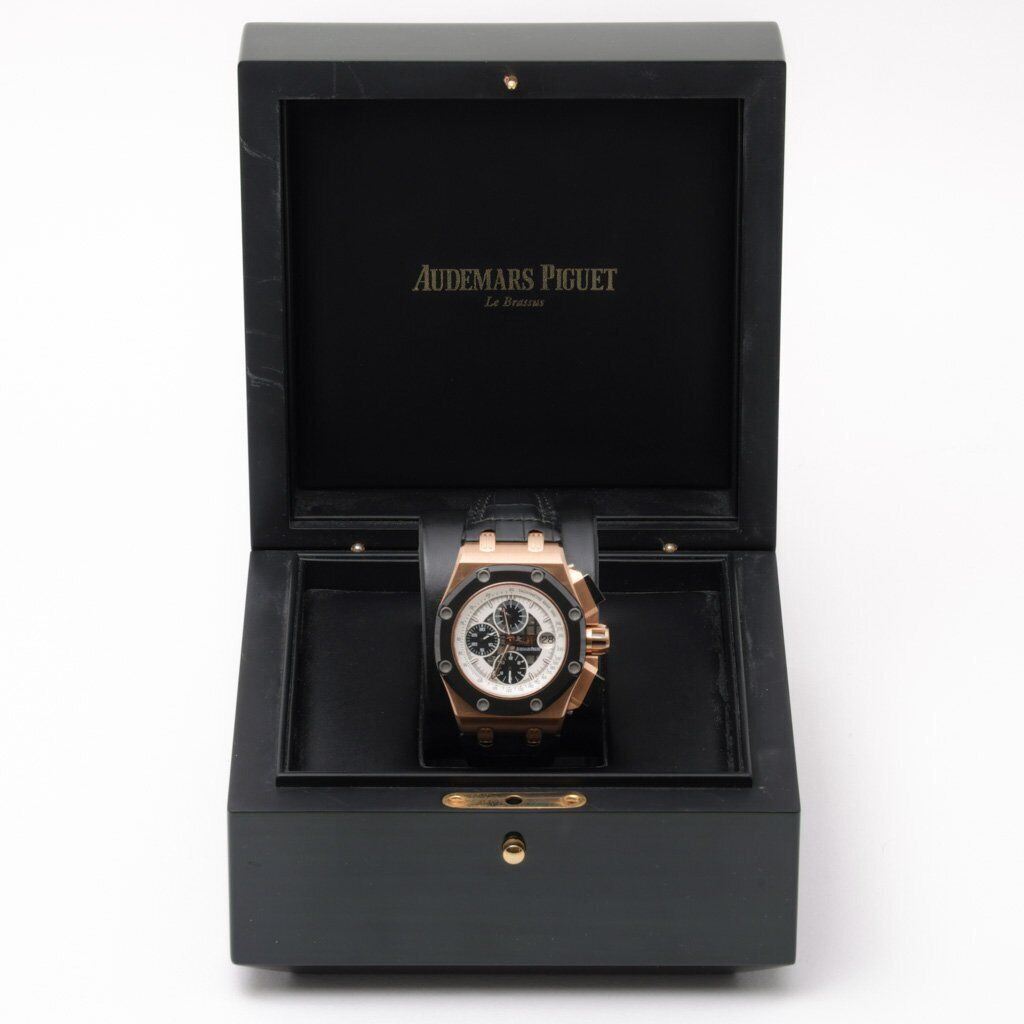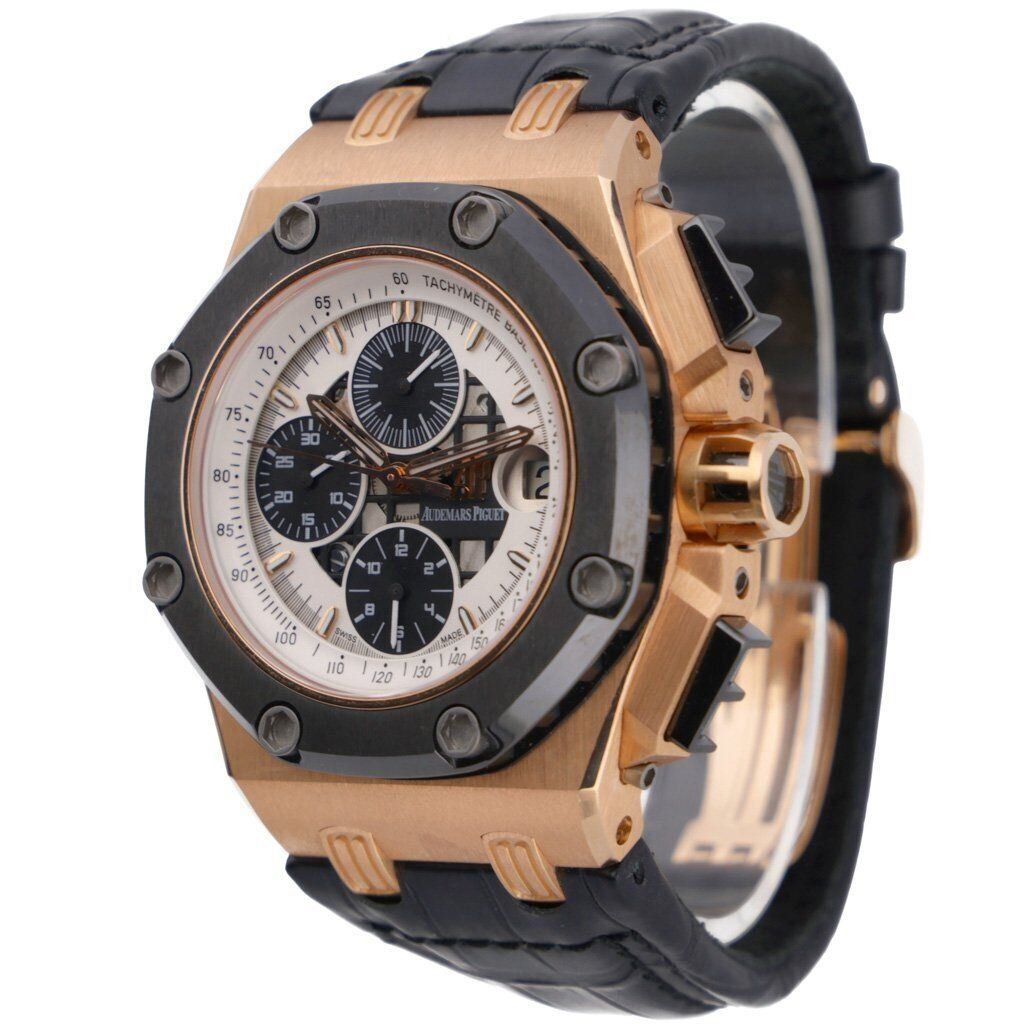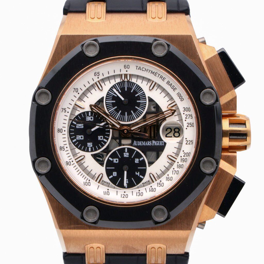 crafted in 18k rose gold by Audemars Piguet. Featuring a semi open white dial with 3 black sub dials displaying a 60 second, 30 minute and 12 hour markers. Complementing the dial is a ceramic octagonal bezel with Audemars Piguet iconic 8 screw design.