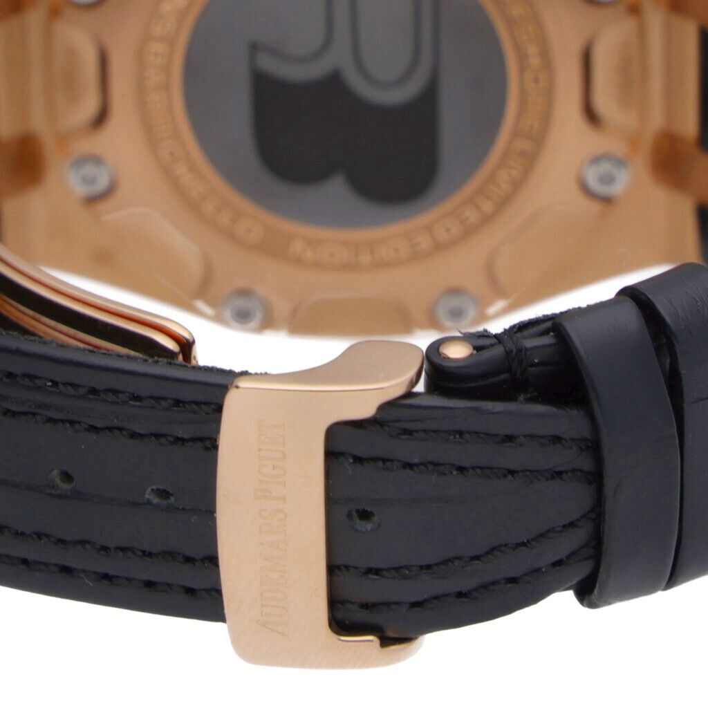 Fitted with a glareproofed sapphire crystal and powered by a self-winding automatic movement. The watch is equipped with an original Audemars Piguet black rubber strap and a 18k rose gold folding clasp.