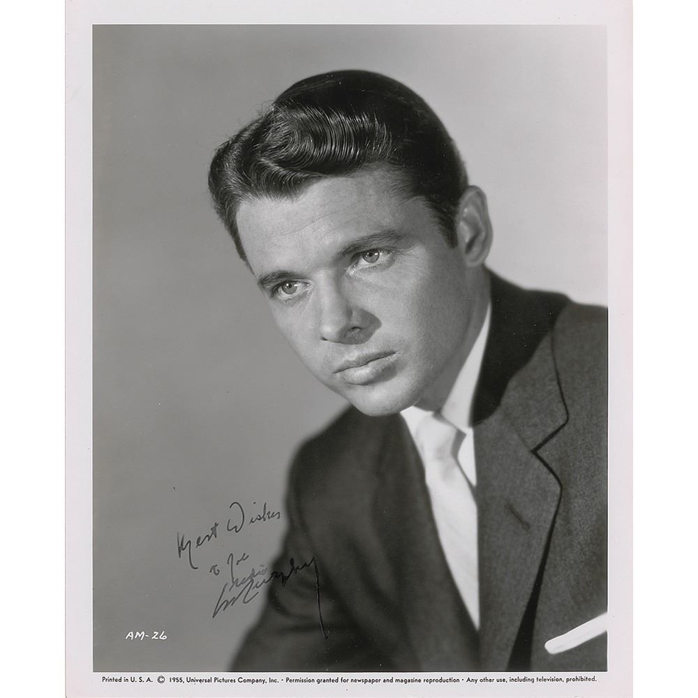 Vintage glossy 8 x 10 Universal Pictures publicity photo of Murphy in a dapper up-close pose, signed and inscribed in fountain pen, "Best wishes to Joe, Audie Murphy.” In fine condition, with some small surface impressions above Murphy's head. Originally obtained in person by a New York autograph collector who collected from the 1950s through the 2000s.