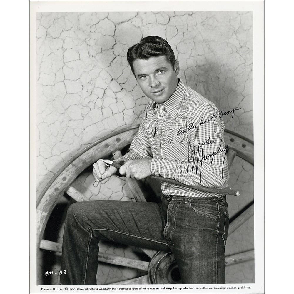 Vintage glossy 8 x 10 Universal publicity photo of Murphy whittling, neatly signed and inscribed in fountain pen, "All the best, George, Audie Murphy." In fine condition.