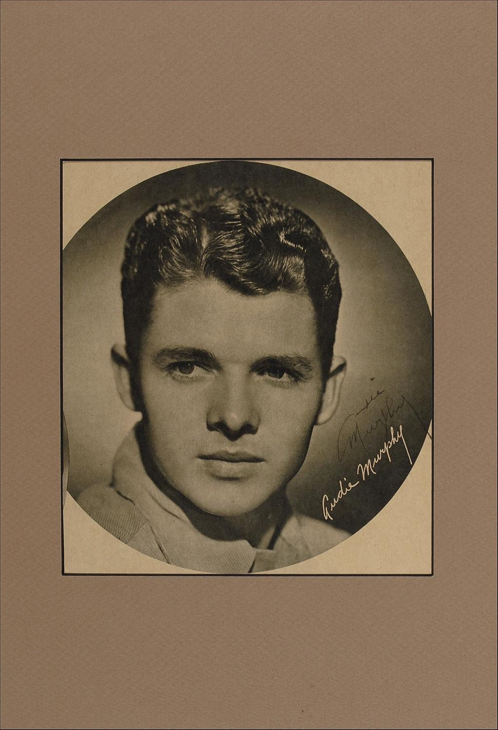 American soldier and actor (1924–1971) whose heroism during World War II earned him the Medal of Honor. After the war, Murphy parlayed his popularity, small-town charm, and baby-faced good looks into a respectable film career, appearing in a string of westerns and war dramas. He died in a plane crash at the age of 46. Terrific vintage 8 x 9 magazine photo of the young Murphy, nicely signed in fountain pen above his white pre-printed signature. Matted to an overall size of 11 x 16. In fine condition.